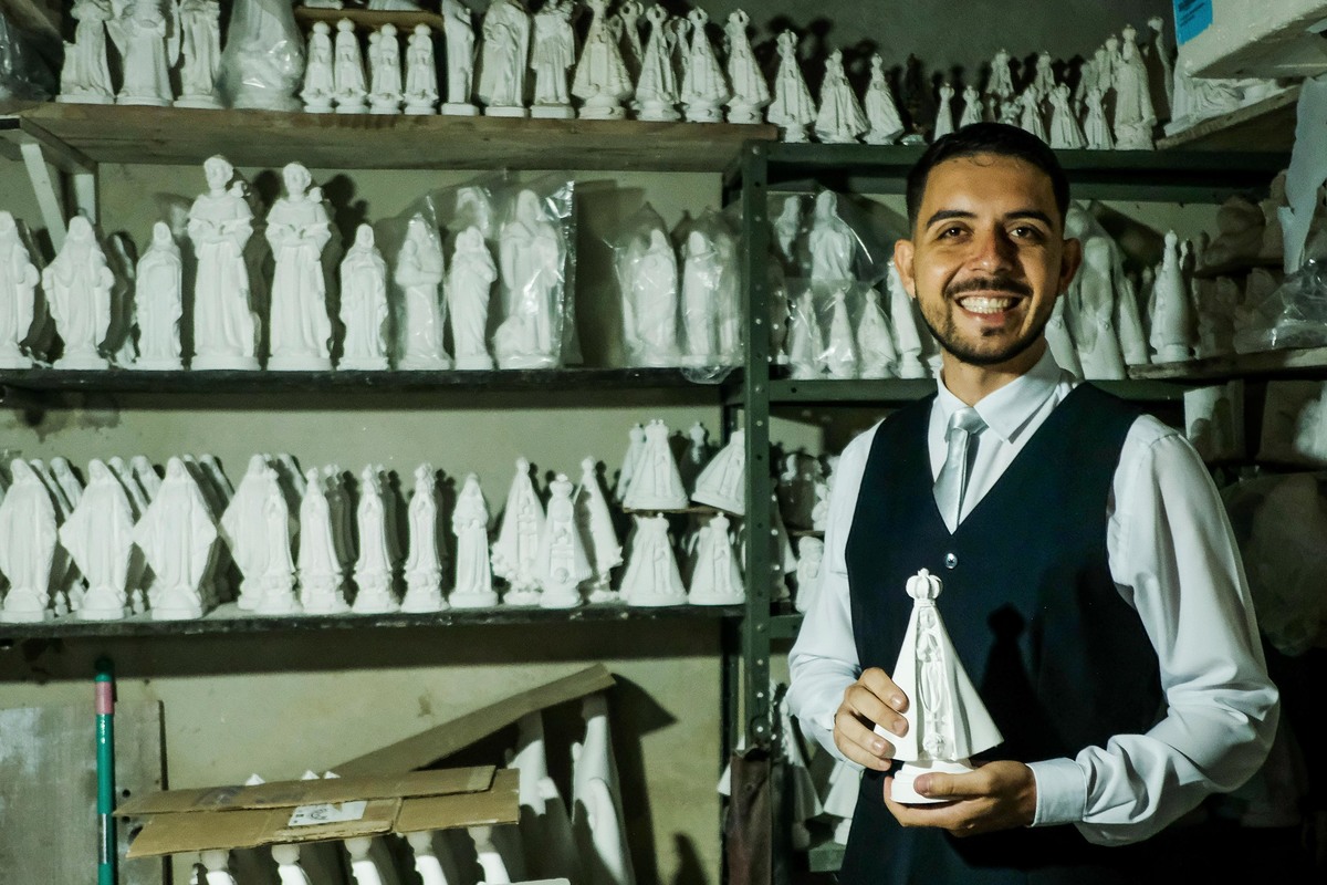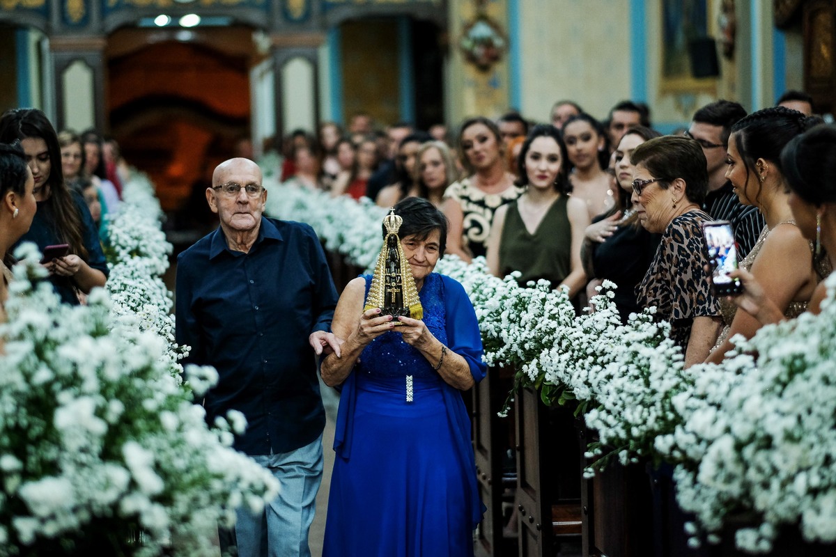 Um detalhe muito bacana é que a Rafaela e o Felipe fabricam imagens personalizadas e juntos fizeram a imagem de Nossa Senhora Aparecida que entrou na cerimônia para abençoar essa união.