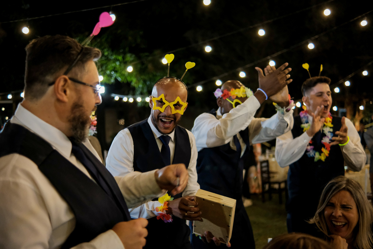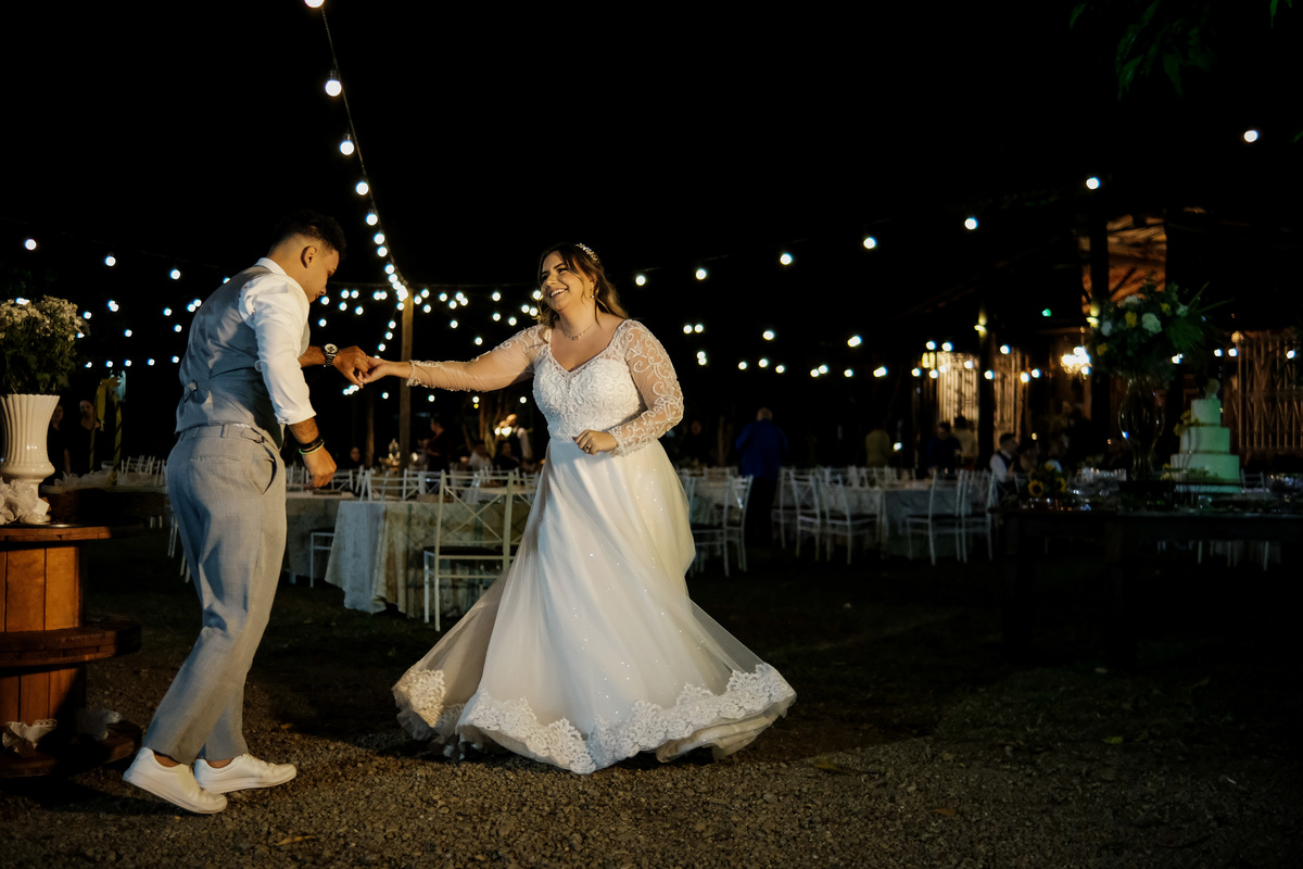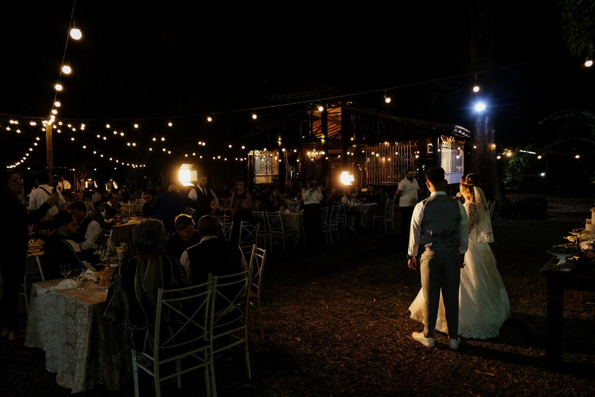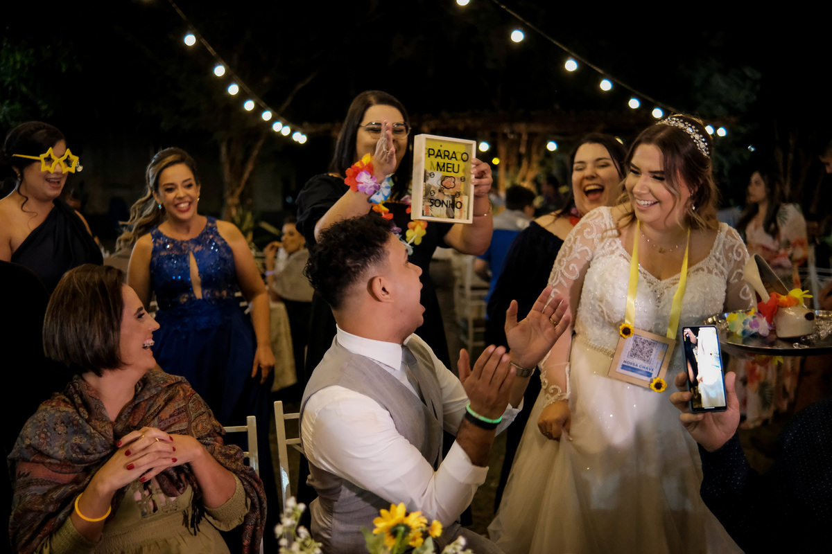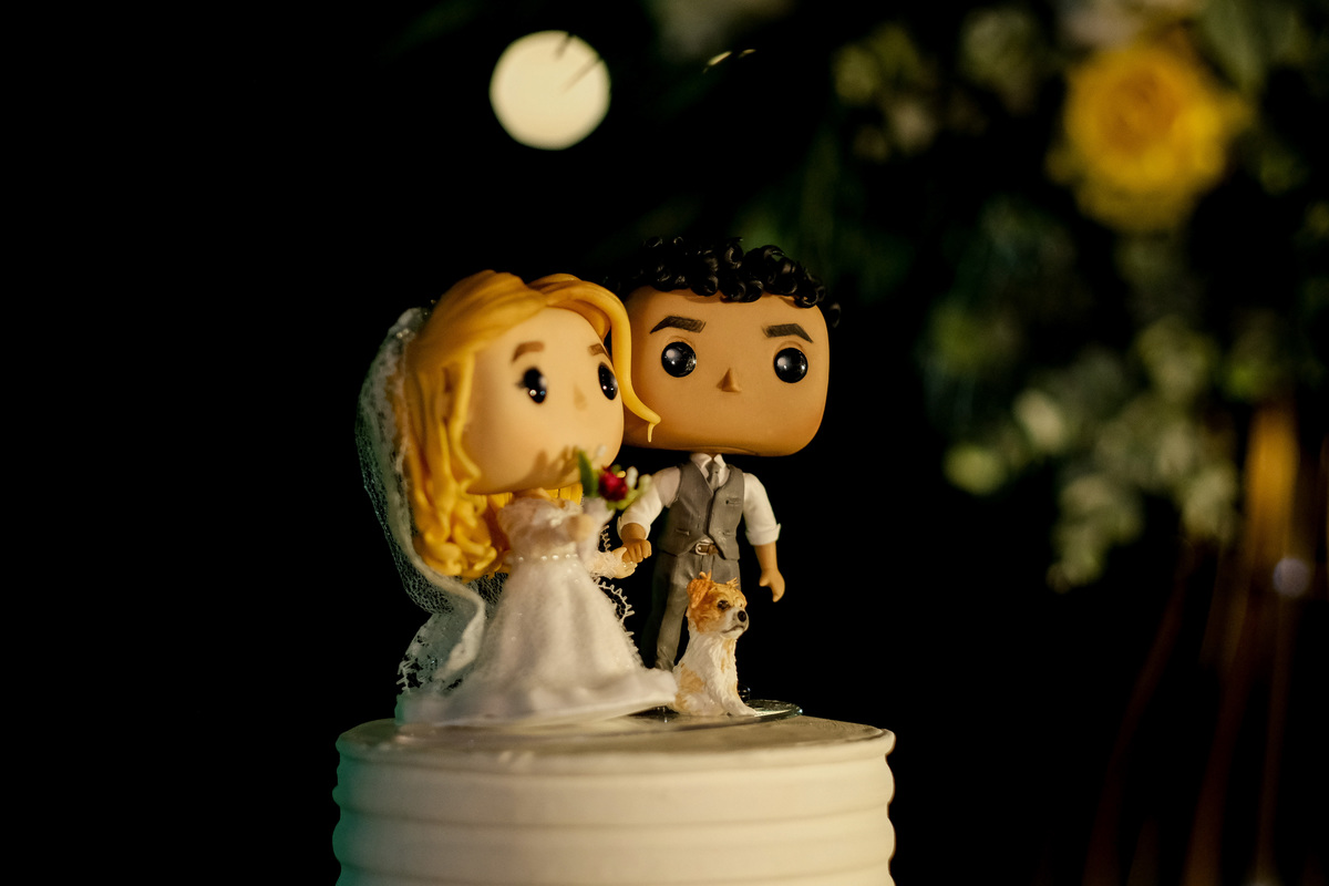 E os lindos detalhes continuaram na recepção, que foi no jardim em frente a Capela do Recanto Vip e ficou encantador com as charmosas luzes, chamada por muitos como festão e os bonequinhos estilo Funko personalizados com a carinha e os looks do casal.