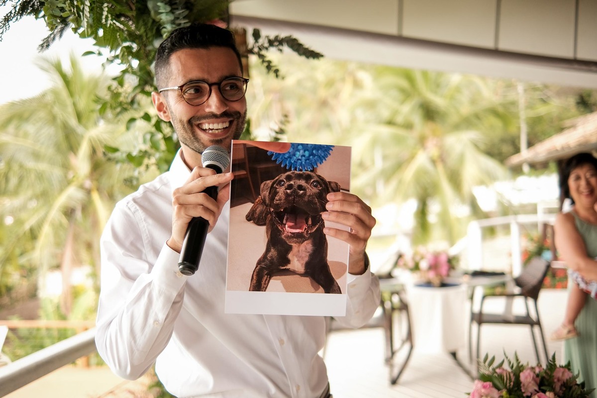 A cerimônia foi conduzida pelo irmão da Karina, o Gui, que mandou muito bem! Confesso que achamos que ele era profissional, conduziu com muita maestria e envolveu a todos, teve também a participação da prima Mariana e do cachorro Kuma Chan, filho do casal, que não pode ir devido ao seu comportamento diríamos, um pouco empolgado rss, mas acompanhou a distância e sua foto estava lá representando, é claro rs