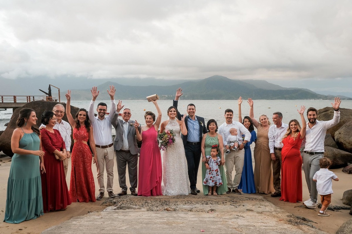 Na sequência reunimos todos e descemos para as fotos protocolares na areia, o que não foi muito difícil pois tinha 19 pessoas contando o casal e as crianças, aproveitamos e fizemos muitas fotos antes de seguir para o jantar 😉