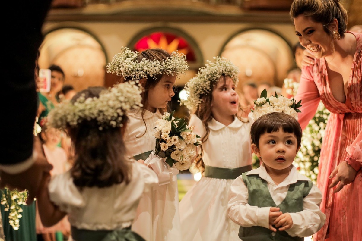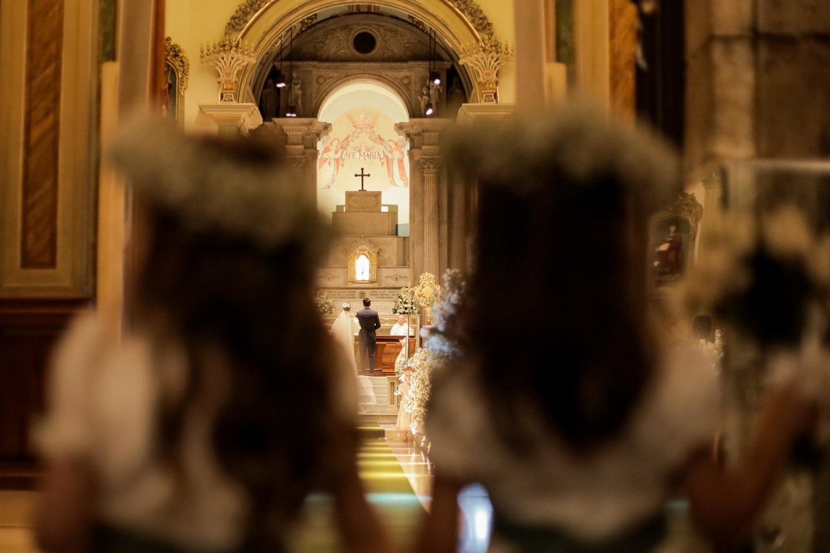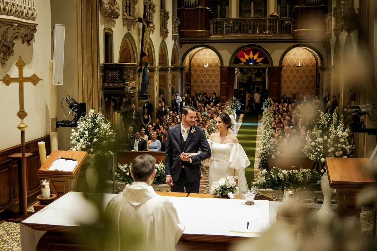 Uma curiosidade muito bacana é que na entrada da Mirella você consegue ver uma multidão de romeiros aguardando ansiosos para vê-la sair do carro, eles nem a conheciam, mas vibravam de alegria e emoção. Não pense que a emoção ficou somente do lado de fora não, a cerimônia foi brilhantemente conduzida pelo Padre Josafá e pelo Padre Ademir, que são amigos de longa data das famílias e vieram para Aparecida exclusivamente para celebrar essa união.