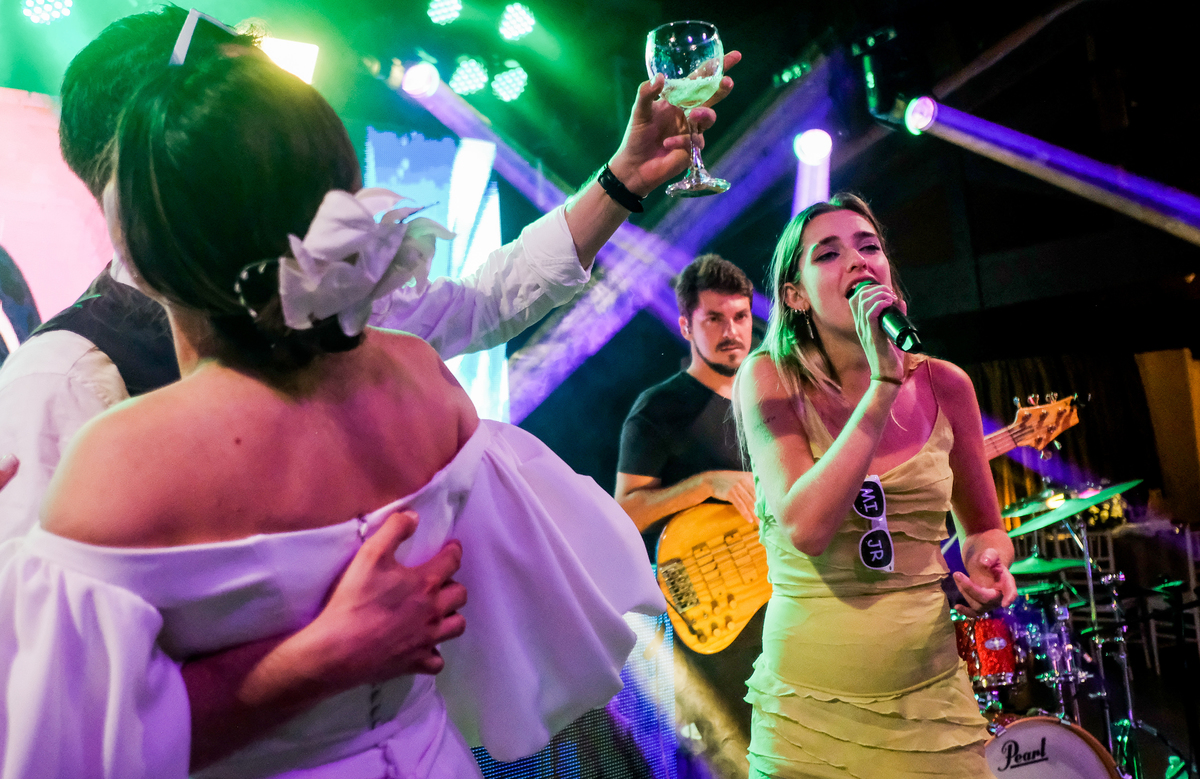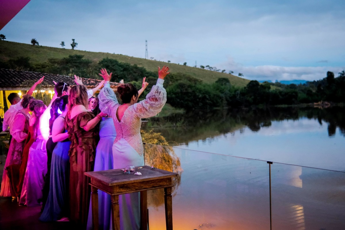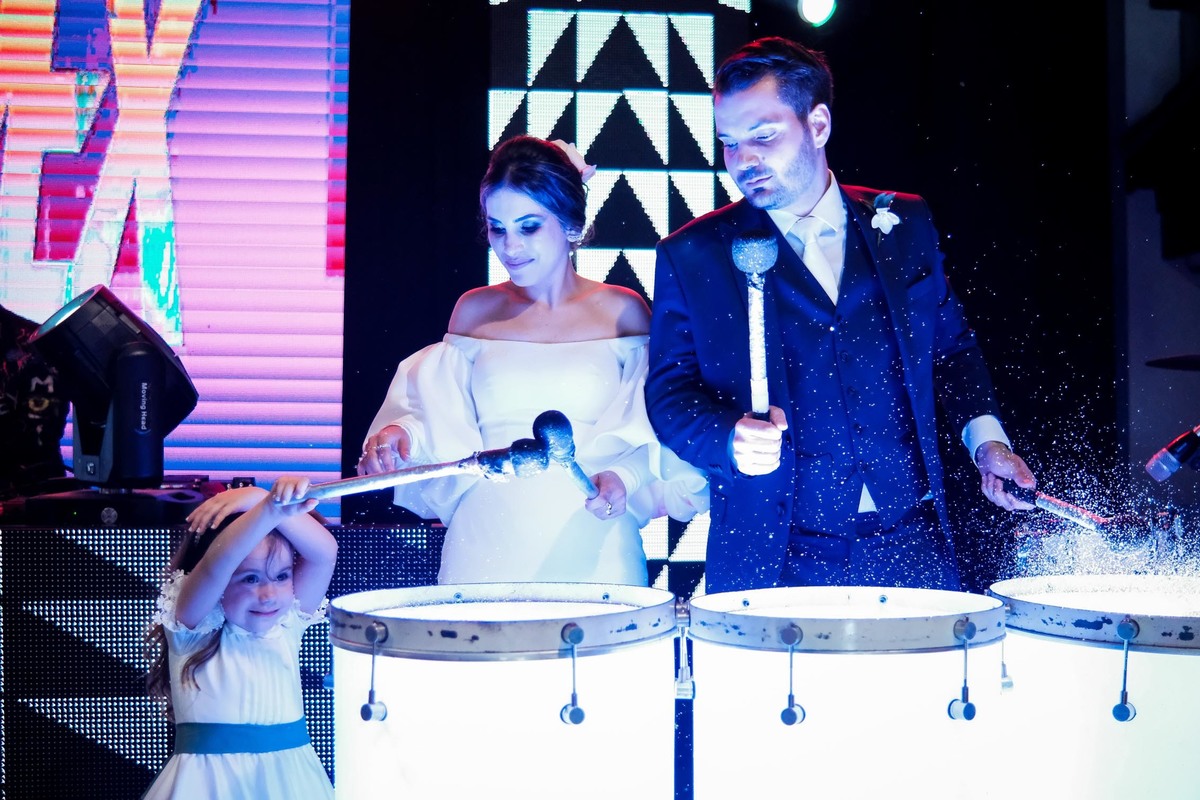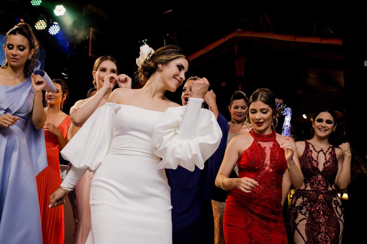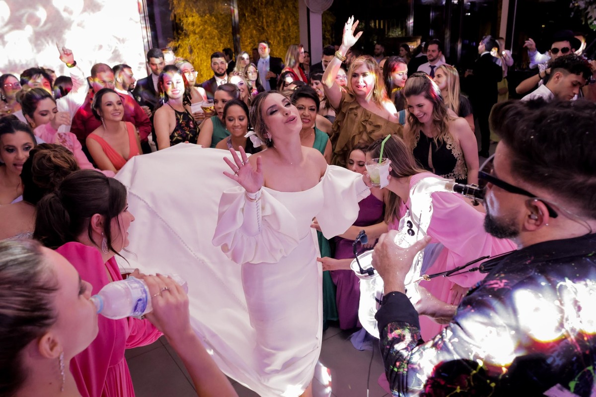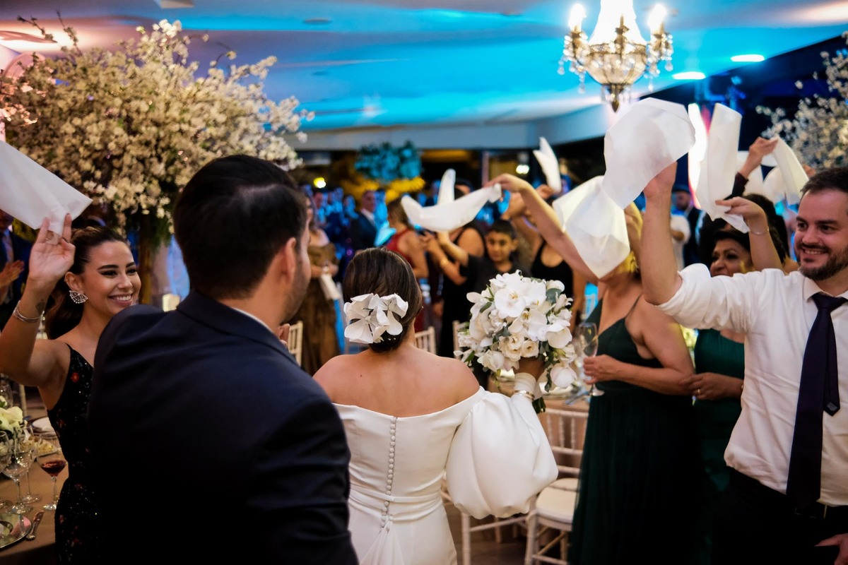 A recepção aconteceu Recanto do Bosque, e já nas entradas uma cena inédita pelo menos para mim, todos os convidados levantaram seus guardanapos ao alto e fizeram uma grande festa na entrada dos noivos, que já emendaram em uma dança superensaiada, no melhor estilo dança dos famosos.
