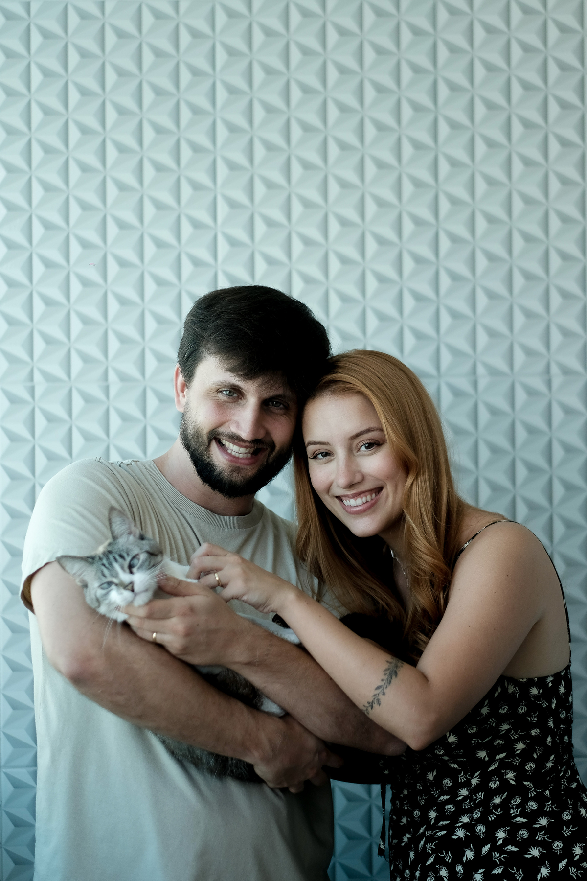 Mas tinha um detalhe o Bruce, gatinho e membro oficial da família não poderia ficar de fora, e claro, como pais de Pet sabemos da importância da família reunida nesses momentos e demos uma corridinha no apê deles para o ensaio ficar completo!!!