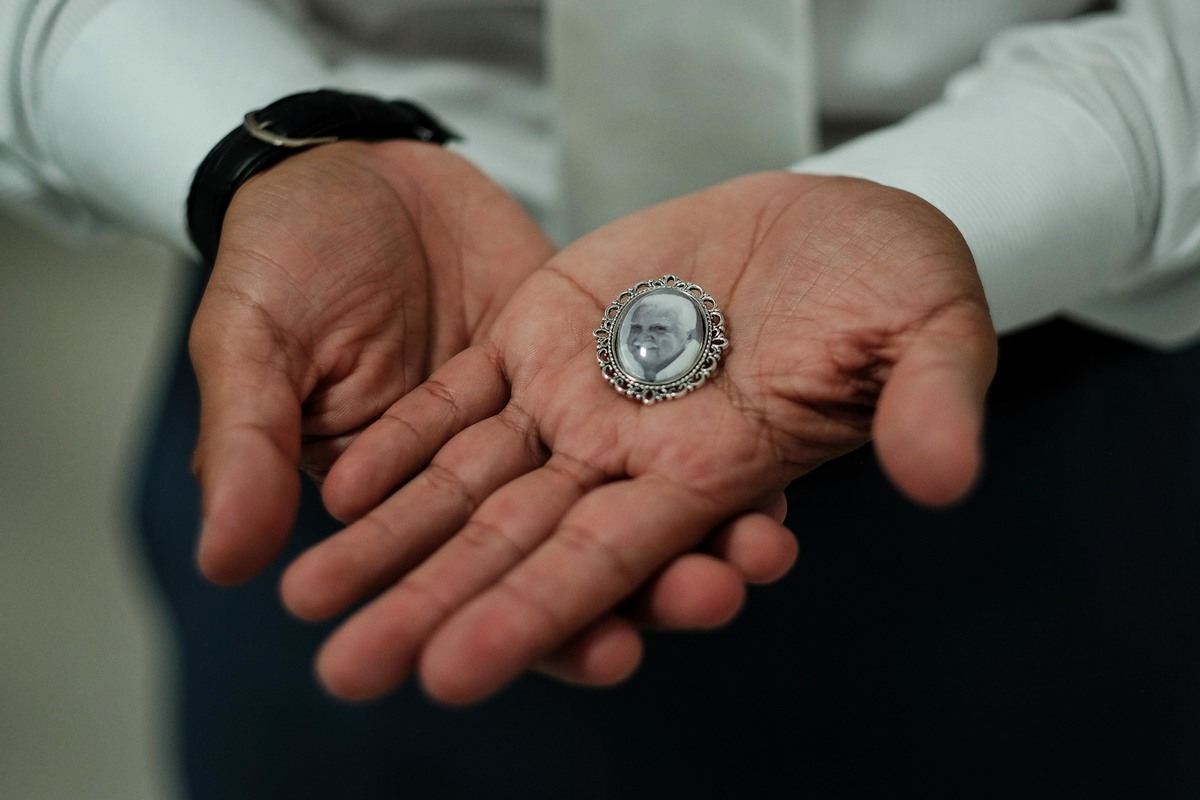 E uma das surpresas foi um lindo relicário do Barão, apelido carinhoso do avô do Xande, que se emocionou muito com o presente e dispensou até o uso da lapela, para dar destaque a linda homenagem.